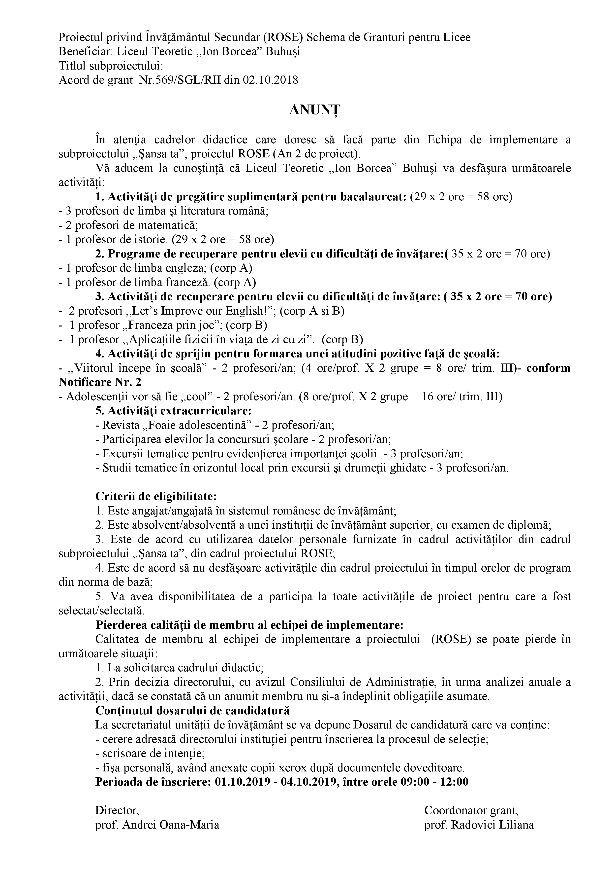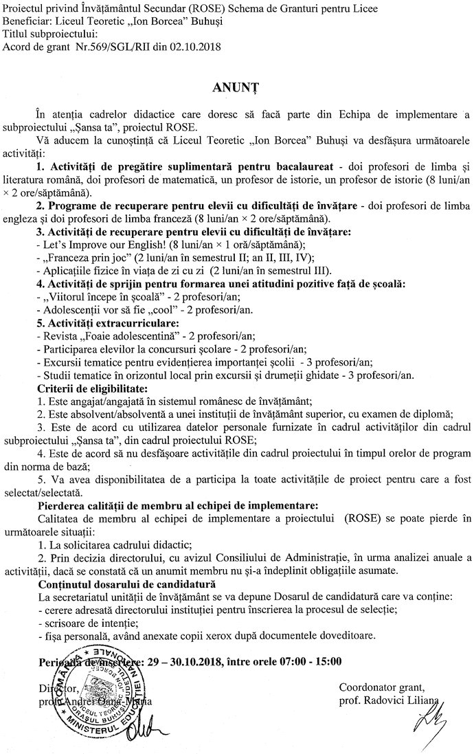 Începând cu luna octombrie 2018, unitatea de învățământ Liceul Teoretic "Ion Borcea" Buhuși a devenit beneficiară a unui grant în cadrul Rundei a doua a Schemei de Granturi pentru Licee (SGL) a Proiectului privind Învățământul Secundar - ROSE, în urma semnării Acordului de grant între Ministerul Educației Naționale - Unitatea de Management a Proiectelor cu Finanțare Externă (MEN-UMPFE) și instituția noastră.